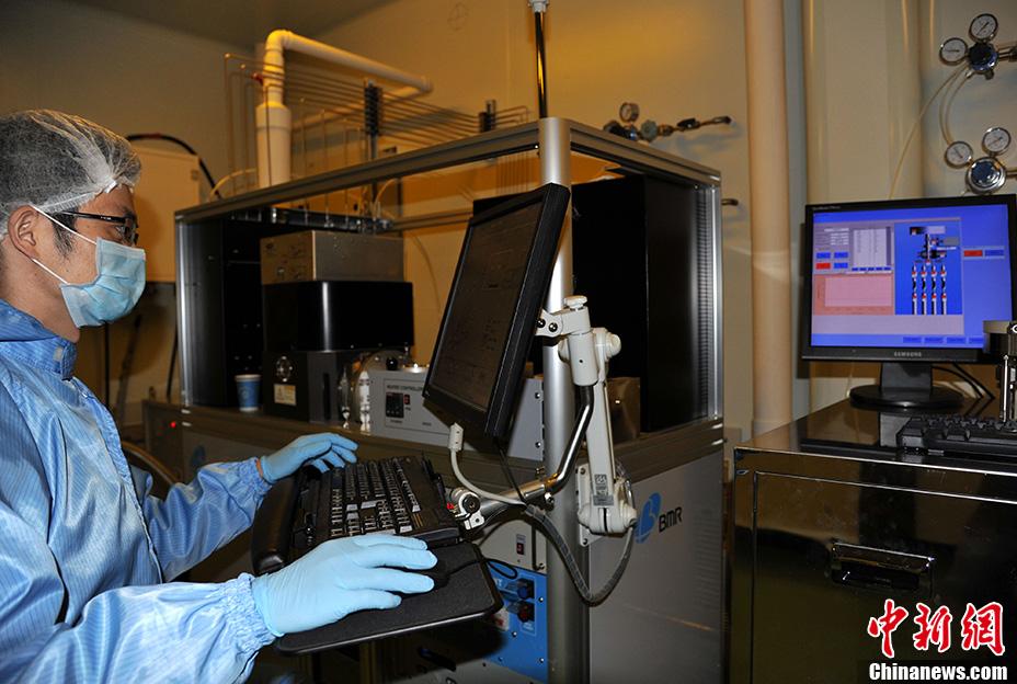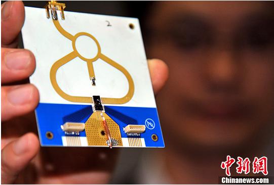 10月23日,设于中国科学技术大学的中国科学院量子信息重点实验室内,科研人员展示原材料为砷化镓的量子芯片(黑色方块部分)。据介绍,量子芯片目前尚处于基础研发阶段,可用于量子计算机等。中新社发 孙自法 摄