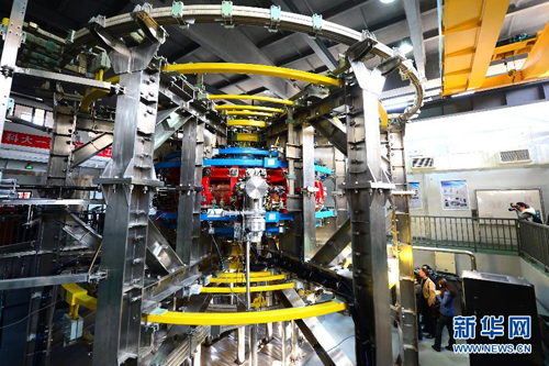 近日,我国首台大型反场箍缩磁约束聚变实验装置(KTX,中文简称“科大一环”),在中国科学技术大学完成安装调试并进入常态化运行。据悉,该装置为科技部“国家磁约束核聚变能发展研究专项”支持的大型装置建设项目,主机总体直径8米,磁场可达7000高斯,等离子体电流达1兆安培,电子温度达600万度,放电时间达100毫秒。据项目工程总指挥、中科大物理学院刘万东教授介绍,KTX是中国完全自行设计、自主研制集成的国际先进反场箍缩装置。它的建成将为国内外从事等离子体物理研究的科研人员提供一个全新的大型实验平台,对中国磁约束聚变领域高端人才培养,发展磁约束聚变能科学技术研究事业具有重要意义。新华社记者刘军喜摄