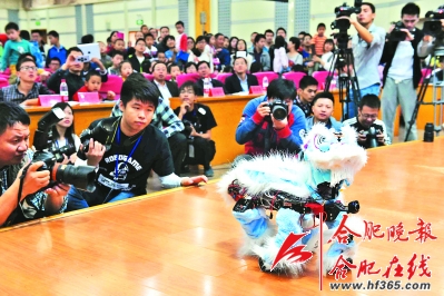 “我们在它身上装有高灵敏度摄像头,通过优化的识别算法,让它可以跟着绣球而动,完成‘追绣球’表演。”参赛队员介绍,为了让机器人更好地移动,他们设计了全新的三自由度腿部结构,让它的移动更灵活。