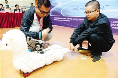 10月11日,中国科学技术大学2015RoboGame机器人大赛举行总决赛,来自中科大的26支学生代表队带着他们亲手制作的机器人参加了民俗艺术机器人和桌面娱乐机器人两个项目的比赛。图为糖画机器人在比赛中表演。新华社记者 刘军喜摄