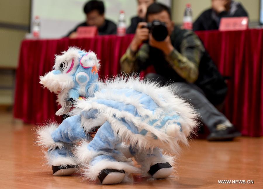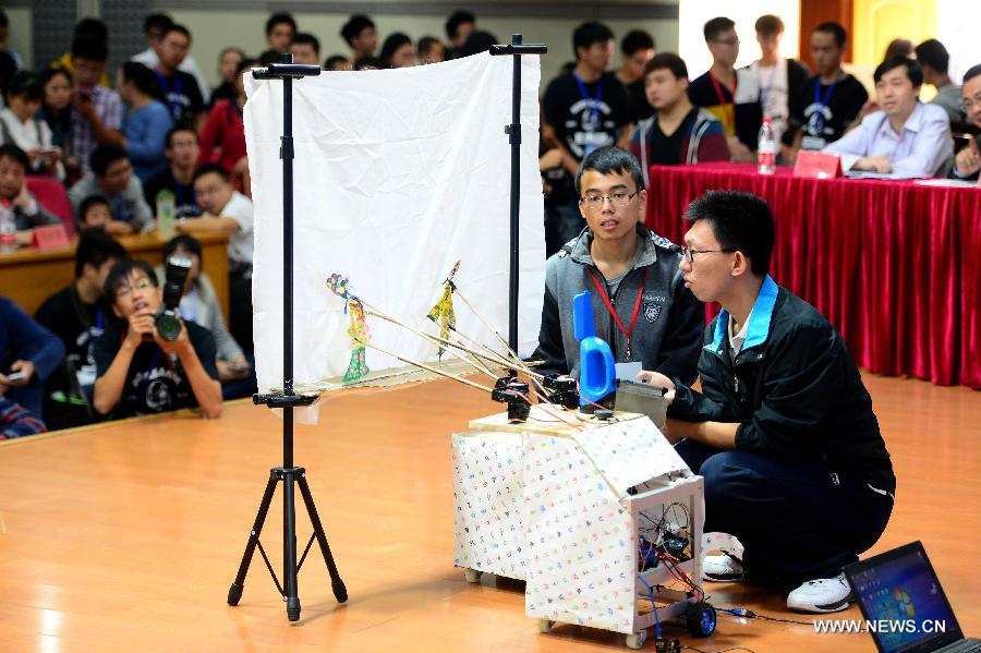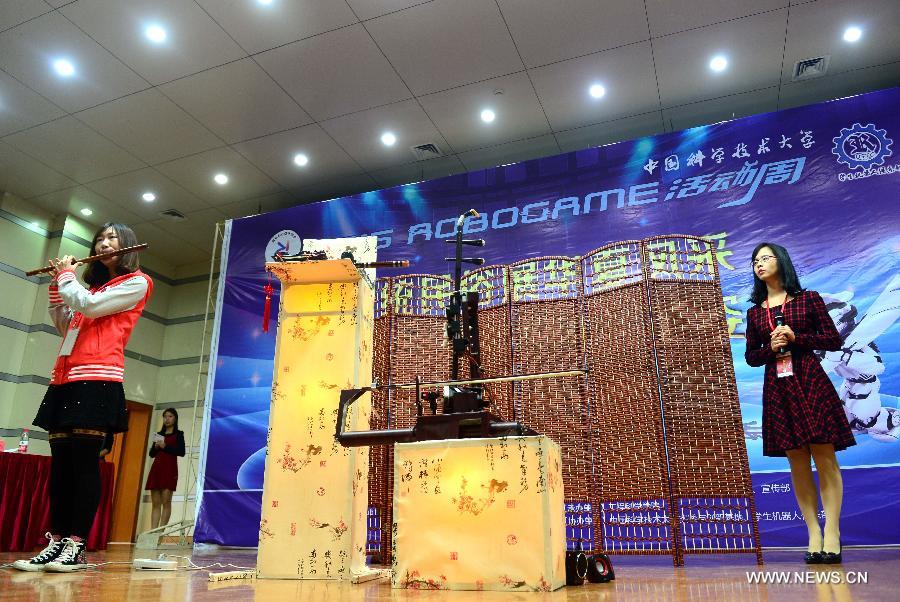 Students demonstrate music playing robot during the final round of 2015 RoboGame Competition of University of Science and Technology of China in Heifei, capital of east China's Anhui Province, Oct. 11, 2015. The competition has 26 teams vying in two categories-Chinese traditional music playing robots and board entertainment robots. (Xinhua/Liu Junxi)