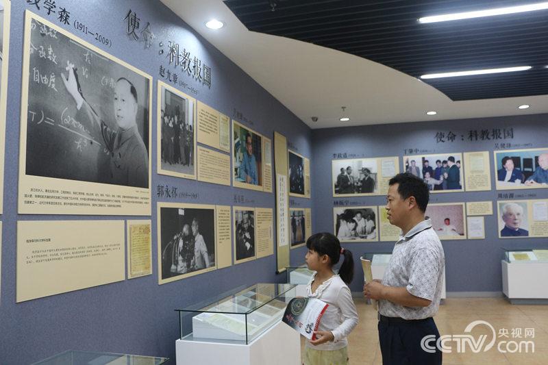 “这个是科大创始人之一,钱学森教授。这个是诺贝尔物理奖获得者李政道,很厉害。”7月10日,在中科大修建中心打工的邓明带着7岁的女儿来到展览室参观。邓明说,他没有上过大学,他希望自己的女儿能考上大学。