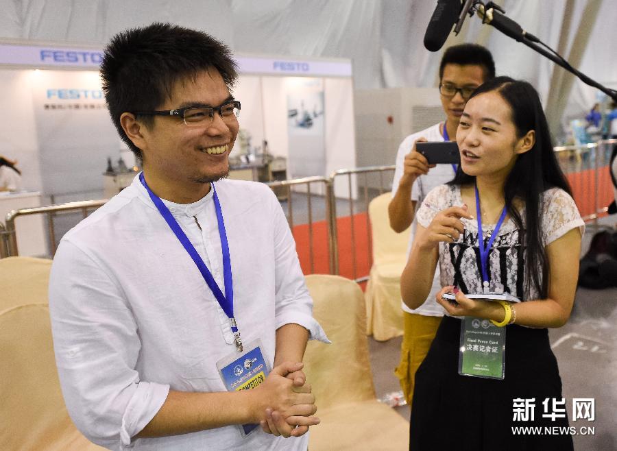 7月22日,中科大蓝鹰队队长李箫(左)在决赛后接受媒体采访。当日,中国科学技术大学蓝鹰机器人足球队以4比0战胜日本HELIOS2015队,获得第19届RoboCup机器人世界杯赛仿真2D组冠军,这也是蓝鹰机器人足球队连续第三年夺得该项目的世界冠军。新华社记者张端摄