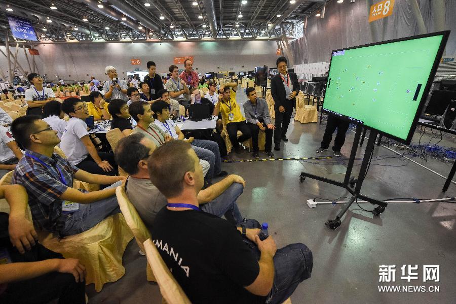 7月22日,观众在安徽国际会展中心观看中科大蓝鹰机器人足球队与日本HELIOS2015队的决赛。当日,中国科学技术大学蓝鹰机器人足球队以4比0战胜日本HELIOS2015队,获得第19届RoboCup机器人世界杯赛仿真2D组冠军,这也是蓝鹰机器人足球队连续第三年夺得该项目的世界冠军。新华社记者张端摄