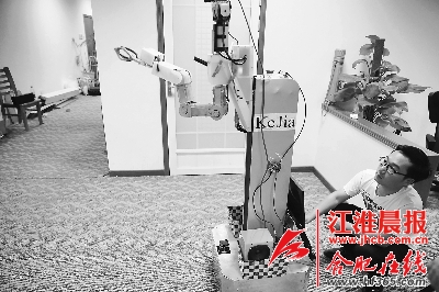 中科大实验室内,工作人员正在调试机器人。晨报记者李福凯摄