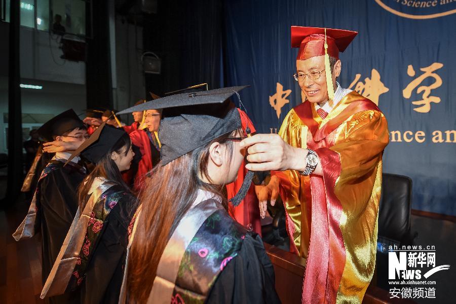 6月21日,中科大校长万立骏(右一)在为毕业生“拨穗”。当日,位于安徽合肥的中国科学技术大学举行2015届本科生毕业典礼,1635名本科毕业生获得学士学位。他们怀着对母校的感恩和对未来的美好憧憬,踏上新的人生旅程。新华社记者张端摄