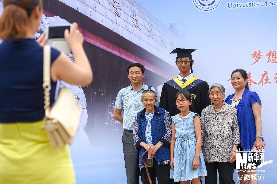 6月21日,一位中科大毕业生(后排中)在毕业典礼结束后与家人合影留念。当日,位于安徽合肥的中国科学技术大学举行2015届本科生毕业典礼,1635名本科毕业生获得学士学位。他们怀着对母校的感恩和对未来的美好憧憬,踏上新的人生旅程。新华社记者张端摄