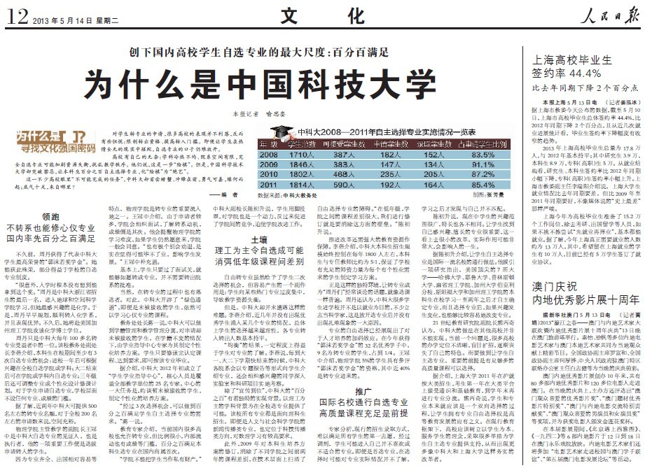 [宁夏日报]中科大实现本科生“百分之百自选专业”