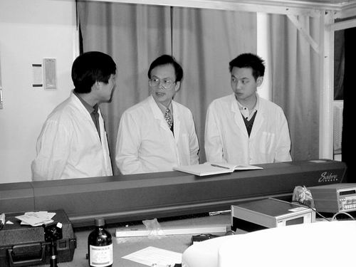 郭光灿(中)与李传锋(左)、黄运锋一起讨论实验问题。
