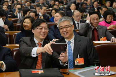 3月3日,中国人民政治协商会议第十二届全国委员会第三次会议在北京人民大会堂开幕。杨元庆委员会前用手机自拍。中新社发 廖攀 摄