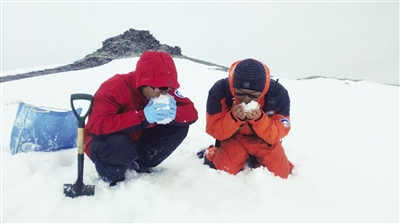科考队员采样途中,补给用完,吃雪解渴(左为包韬)