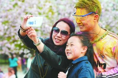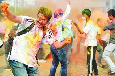 昨天,学生们正在中科大东区参加“彩虹跑”。当日,一场名为“炫动校园”的“彩虹跑”在中国科学技术大学校园内精彩上演,来自中国科学技术大学、安徽大学、合肥工业大学的100多名学生和市民、游客尽情抛撒彩色粉末以示祝福,在奔跑中倡导健康快乐生活。