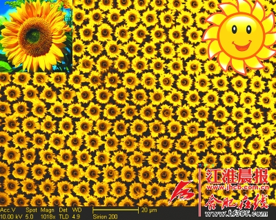 说明:用氧化锌材料组成的纳米片组装结构阵列,在显微镜下观察,像是一片金黄的“向日葵花海”,而在现实生活中,这种材料可以应用于太阳能电池、环境检测等领域。