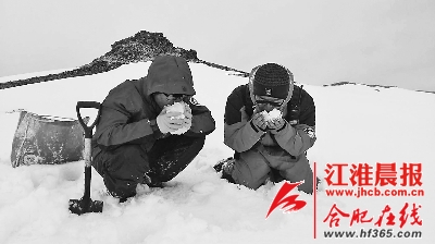 科考队员在采样途中,步行八小时后补给用完,吃雪解渴。(左一为包韬)。