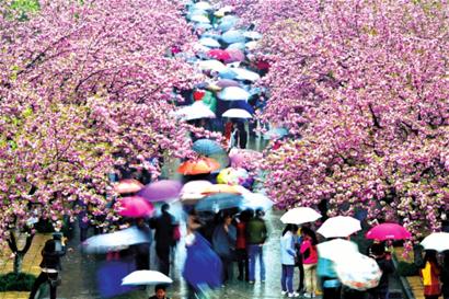 清明节期间,位于安徽合肥的中国科学技术大学举办“春风汉韵”樱花游园会。雨中盛开的樱花和身着汉服表演的学生吸引了众多游客