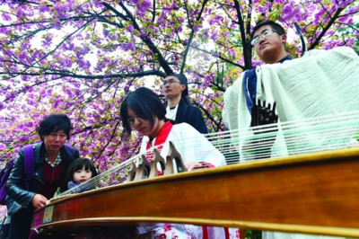 昨日,中科大校园里樱花怒放。大学生们借着樱花美景,宣扬汉文化精髓,以一曲琴音、一袭汉服带领游客体验汉朝古风,慕名前来赏花的游客也愉快地参与其中,一同体验汉朝古风。