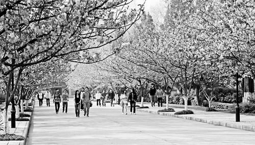 又是十年岁月的静静流淌,人们忽然发现,这些原本不起眼的樱花树慢慢长高长大,变得风姿绰约,繁花满枝头,于是“樱花大道”的美名不胫而走。后来,学校绿化部门干脆将校园里一些零散的樱花树,集中移植到老北门外到黄山路大门口一带,使得樱花大道延展了一倍,更加蔚为壮观。