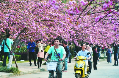 近十几年来,科大的樱花一年比一年茂盛,已成为合肥市民春游必去的一景。据了解,科大樱花大道上共有100余株樱花,樱花盛开时花瓣层叠如粉色云朵,蔚为壮观。值得一提的是,这里还有着全市唯一一株罕见的绿色樱花。