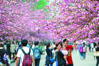 4月1日,中科大东区樱花迎宾大道上,盛开的樱花吸引了许多市民和师生前来观赏。据了解,科大校园里有100多株樱花树,花期约一周,免费向市民开放。 本报记者 杨竹 摄