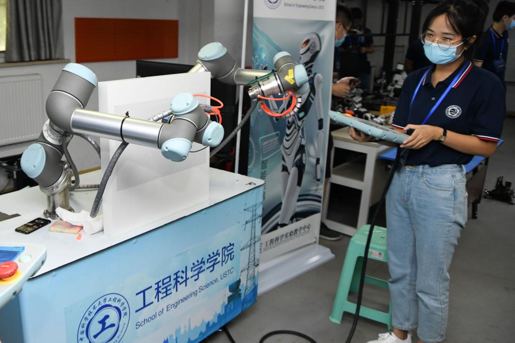 8月29日,在中国科学技术大学工程科学科普点,工作人员在进行协作型机器人演示。