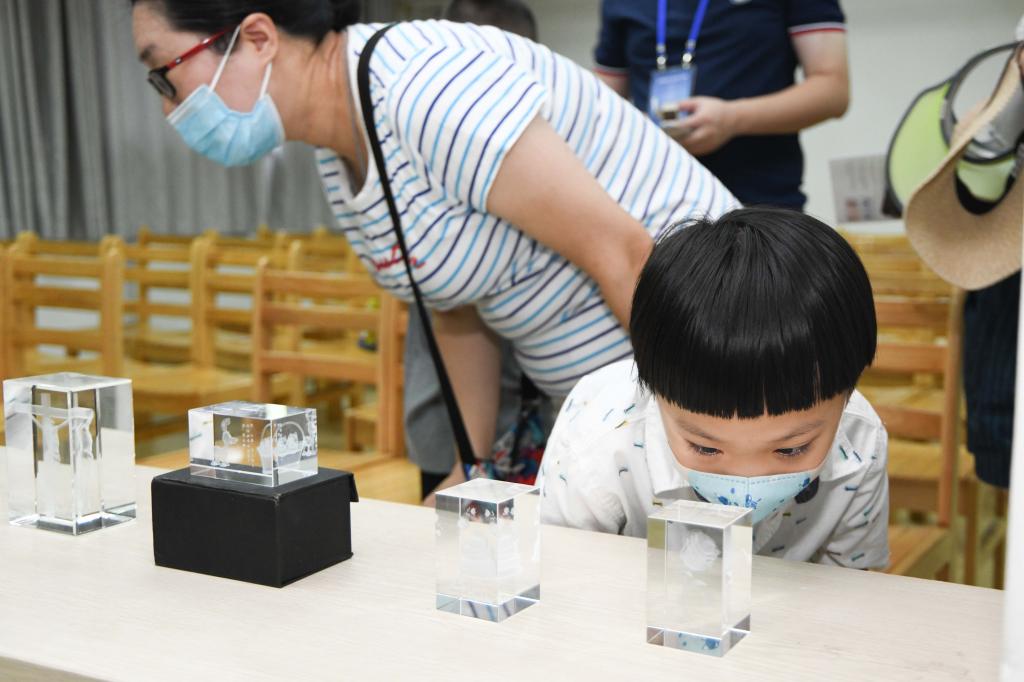 8月29日,在中国科学技术大学工程科学科普点,观众在观看通过激光内雕技术制作的展品。