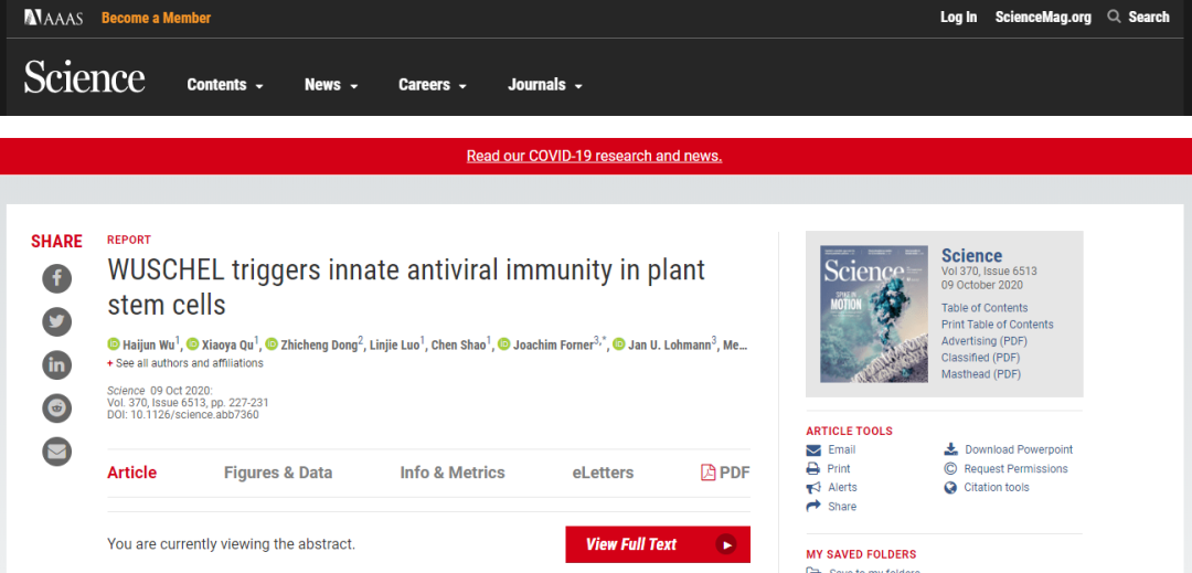中国科学技术大学生命科学学院赵忠教授团队通过发育生物学和植物病毒学两个领域的交叉研究,找到了植物干细胞免疫病毒的关键因子—WUSCHEL(WUS)蛋白,揭示了植物干细胞的广谱抗病毒机制。该成果以“WUSCHEL triggers innate antiviral immunity in plant stem cells”为题发表在《Science》杂志上。