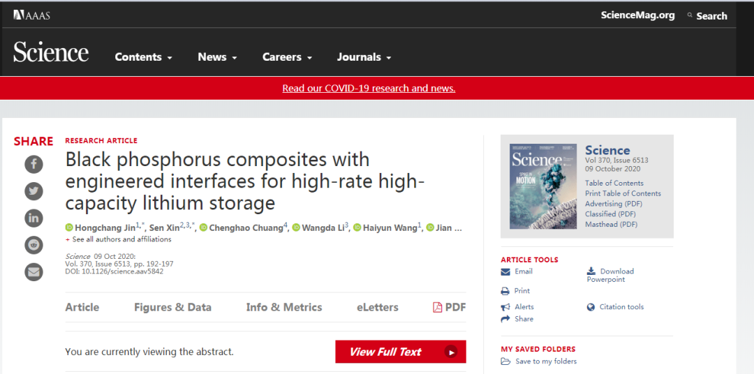 中国科学技术大学季恒星教授研究组与合作者们在新型锂离子电池电极材料研究方面取得重大突破:全新设计的黑磷复合材料使兼具高容量、快速充电且长寿命的锂离子电池成为可能。该成果以“Black Phosphorus Composites with Engineered Interfaces for High-Rate High-Capacity Lithium Storage”为题在《Science》发表。