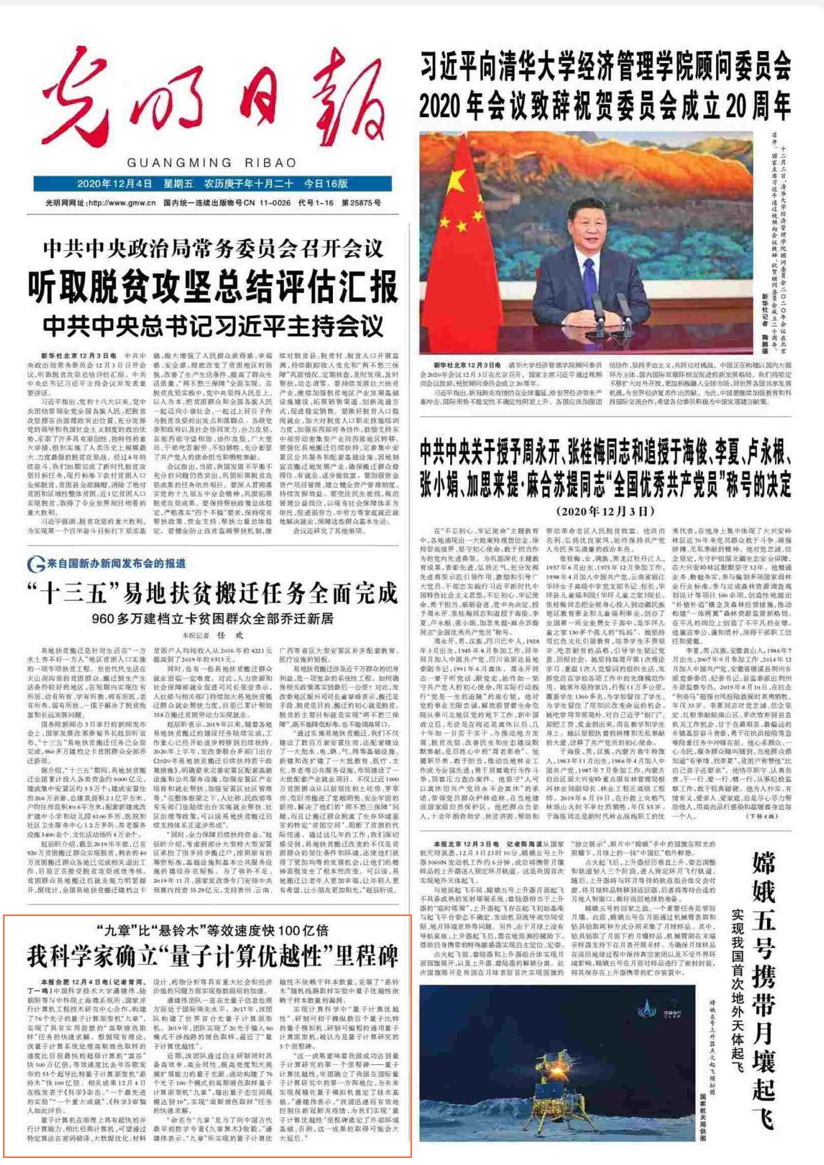 本报合肥12月4日电(记者常河、丁一鸣)中国科学技术大学潘建伟、陆朝阳等与中科院上海微系统所、国家并行计算机工程技术研究中心合作,构建了76个光子的量子计算原型机“九章”,实现了具有实用前景的“高斯玻色取样”任务的快速求解。根据现有理论,该量子计算系统处理高斯玻色取样的速度比目前最快的超级计算机“富岳”快100万亿倍,等效速度比去年谷歌发布的53个超导比特量子计算原型机“悬铃木”快100亿倍。相关成果12月4日在线发表于《科学》杂志。“一个最先进的实验”“一个重大成就”,《科学》审稿人如此评价。
