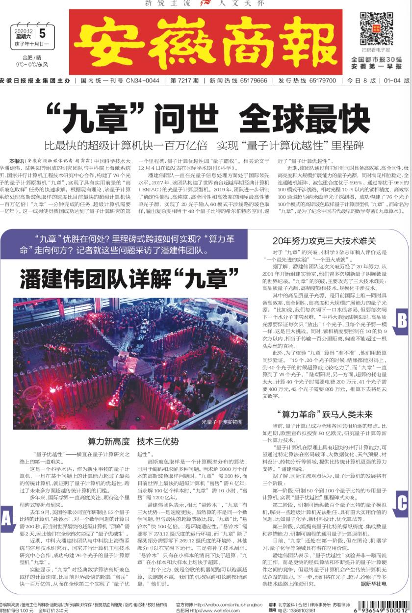 本报讯(安徽商报融媒体记者 胡霈霖) 中国科学技术大学潘建伟、陆朝阳等组成的研究团队与中科院上海微系统所、国家并行计算机工程技术研究中心合作,构建了76个光子的量子计算原型机“九章”,实现了具有实用前景的“高斯玻色取样”任务的快速求解。根据现有理论,该量子计算系统处理高斯玻色取样的速度比目前最快的超级计算机快一百万亿倍(“九章”一分钟完成的任务,超级计算机需要一亿年)。这一成果使得我国成功达到了量子计算研究的第一个里程碑:量子计算优越性即“量子霸权”。相关论文于12月4日在线发表在国际学术期刊《科学》。