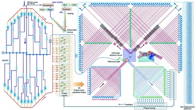 “玻色取样是用来展示量子计算优越性的特定任务中的一项,一直被科学家寄予厚望。”袁岚峰说,“大致可以理解为,一个光路有很多个出口,问每一个出口有多少光出去。”