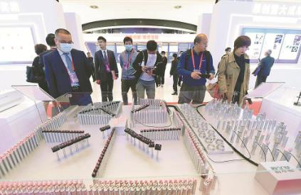 4月26日,2021中国(安徽)科技创新成果转化交易会科技创新成果展在合肥滨湖会展中心举行。图为观众在参观中国科学技术大学研制的量子计算原型机“九章”模型。 本报记者 徐旻昊 摄