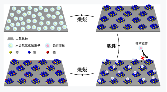 为了高效地分隔金属原子,研究人员开发出一种液相静电吸附的合成方法,将高密度的铈原子附着在氧化硅表面,随后使其自下而上受控团聚为仅2纳米的孤立“岛”。随后,他们巧妙地利用零电点原理,使氧化铈岛和氧化硅载体表面分别带上相反电荷,从而实现了铂原子的择位生长。由于小尺寸“纳米岛”的吸附面积有限,通过控制铂前驱体浓度,就可以实现平均每个“岛”上不超过一个铂原子的目标。