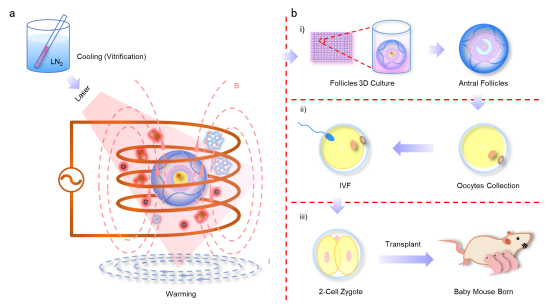 赵刚教授领衔的低温生物医学研究团队,开发了基于协同抑冰策略的小鼠卵泡低浓度低温保护剂玻璃化保存方法。他们将磁热和光热空间复温与水凝胶微封装结合,实现了协同抑冰,将渗透性保护剂的浓度降低了75%。其中空间复温技术可有效提升复温速率和温度分布均匀性,抑制复温过程可能出现的反玻璃化/重结晶,避免过大的细胞损伤。水凝胶封装则既可提供关键生化和力学微环境的调控,有力支撑复温后小鼠卵泡的3D培养体外发育;又可提供结构仿生低温保护,减少毒副性低温保护剂的需求;还可以实现卵泡与外界磁热和光热材料的物理隔离,提高生物安全性。经此方法保存的卵泡,冷冻复苏后其存活率提高了约三分之一;且其经体外3D培养后可成功排出成熟的卵母细胞,该卵母细胞进一步体外受精并移植到代孕小鼠体内可产下健康的子代小鼠。