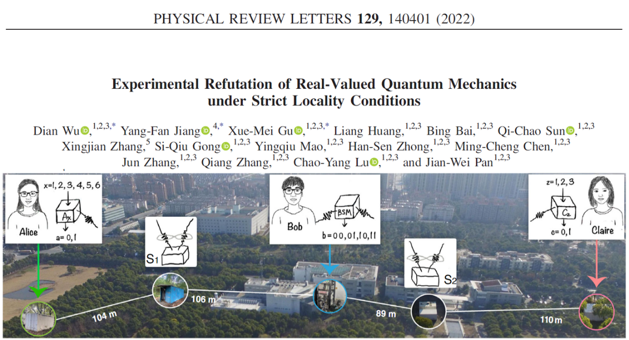 潘建伟团队在国际上率先开展了对实数量子力学的一系列检验。2021年,团队基于自主研发的超导量子体系,采用了I形的Transmon量子比特设计来增加量子比特之间的间距,以减少在同一个超导芯片上的比特之间的近邻耦合。通过高精度的量子操控技术,两个纠缠脉冲序列用于制备两对纠缠态,将量子比特分发给参与的三方。每一方各自独立选择要在其量子位上执行的测量操作,包括一个完整的贝尔态测量。最后,根据测量结果的联合统计分布计算量子博弈游戏的分数,仅用实数的参与者最多可以获得7.66分,而实验结果显示,由4个超导量子比特组成的三方参与者可以获得8.09(1)分,以超过判据43个标准差的实验精度首次证明了复数在标准量子力学形式中的必要性。