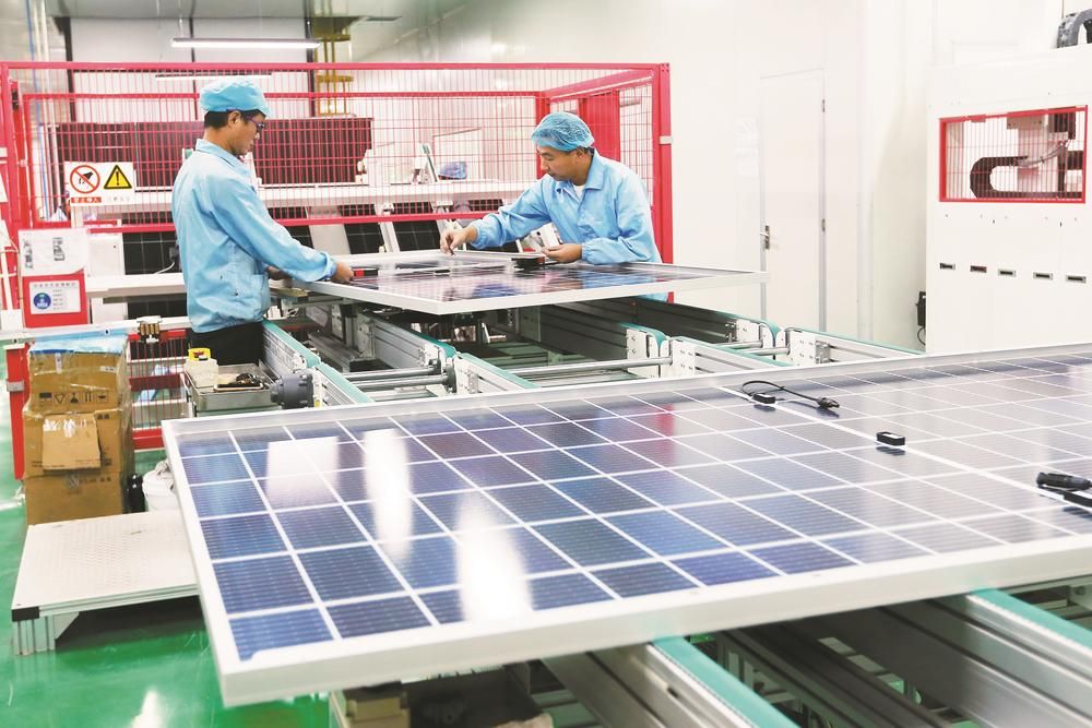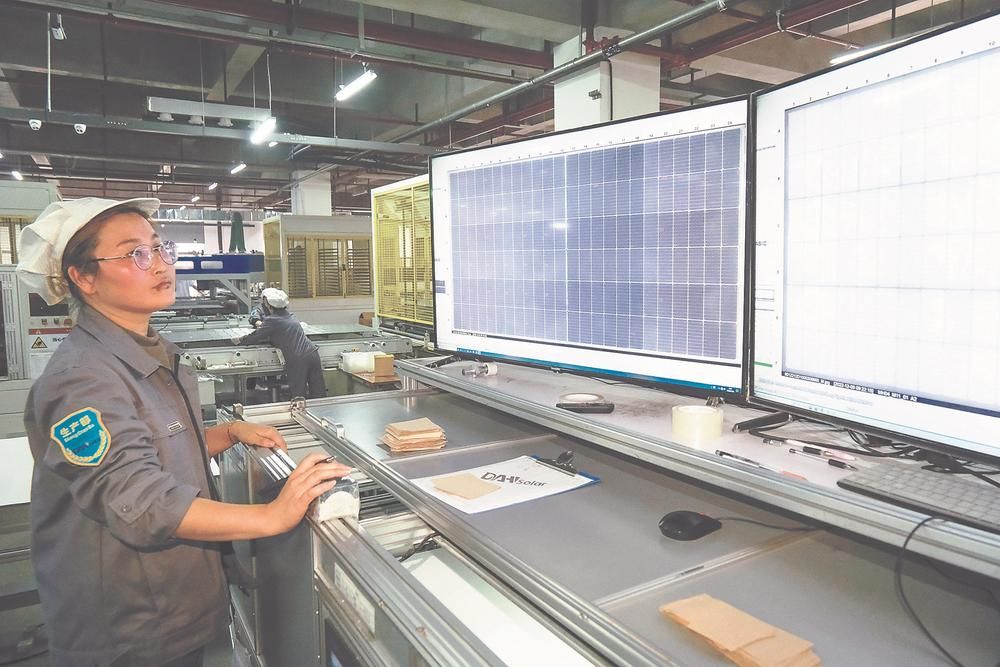 12月9日,在合肥庐阳经济开发区大恒能源科技有限公司太阳能光伏组件生产车间,工人正在对产品进行检测和加工。本报通讯员 赵明 摄