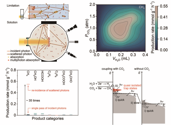 此外,利用等离激元催化的多光子吸收特点,研究团队设计优化了反应装置,实现了散射光子的高效吸收,从而突破了当前光驱动二氧化碳资源化利用领域的瓶颈。