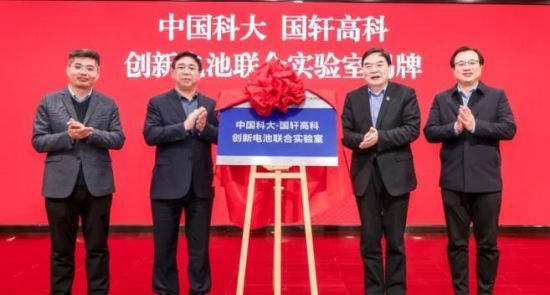 中国科大校长包信和(右二)、国轩高科董事长李缜(左二)为创新电池联合实验室揭牌;中国科大党委常委、副校长傅尧(右一),国轩高科工研总院常务副院长张宏立(左一)出席仪式