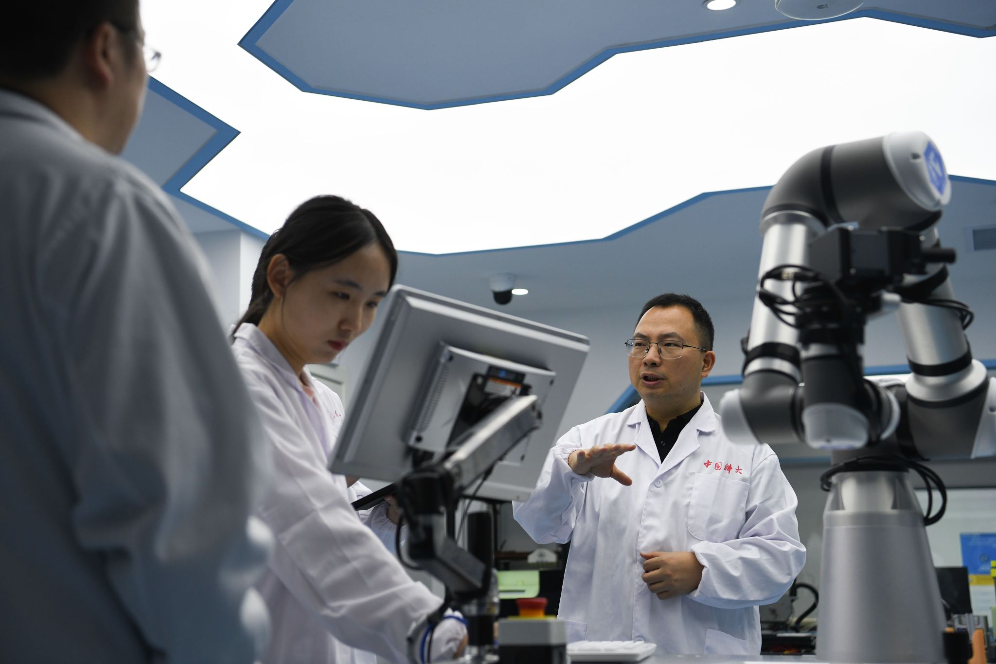 化学与材料科学学院江俊教授(右)指导学生进行机器化学实验。张大岗 摄