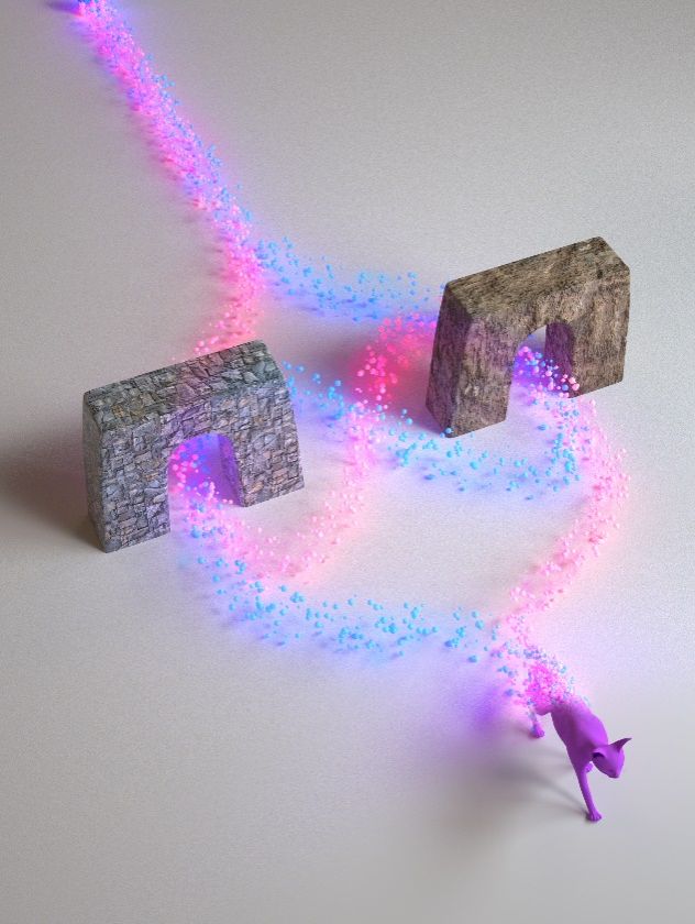 量子不确定因果序的示意图。蓝色和红色路线经过两个门的时序不同且处于量子叠加态。中国科大供图
