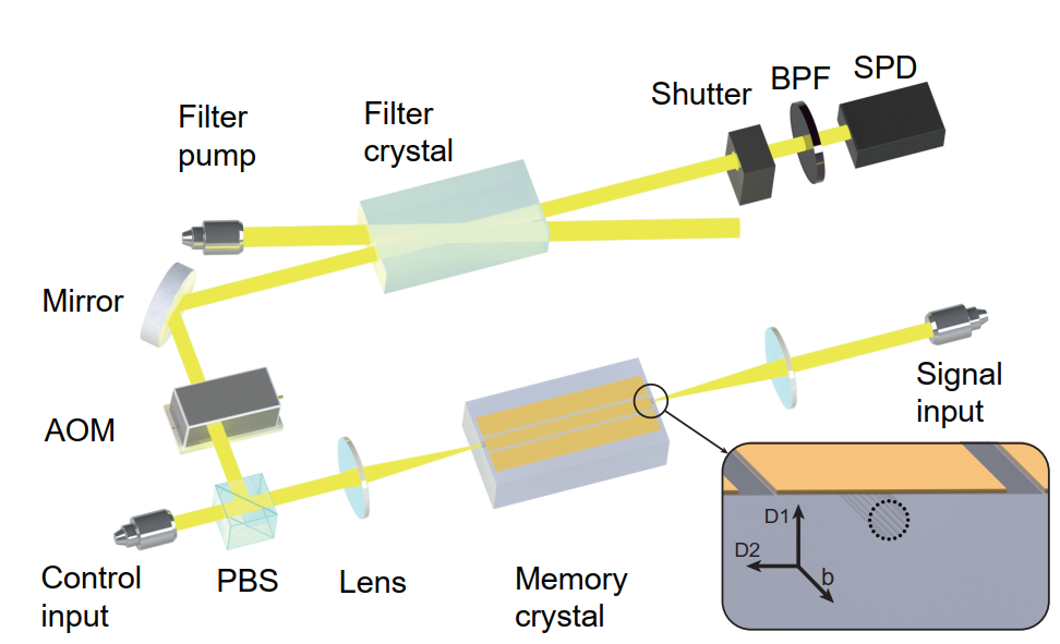 光量子存储器作为克服信道损耗、构建大尺度量子网络的核心器件,其规模化应用需实现器件的集成化,从而达到小尺寸、低功耗的目标。自2011年以来,国际上已利用多种工艺在稀土掺杂晶体中制备了可集成量子存储器。然而,由于集成器件中噪声难以滤除且存储效率受限,现有装置仅能实现在原子激发态的存储,存储时间仅达10微秒级,存储效率远低于光纤延迟线的传输效率,从根本上限制了其在远程量子通信中的实际应用。