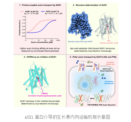 同时,研究团队进一步解析了AUX1在CHPAA结合状态下的结构,为其抑制机理提供了见解,并提出了AUX1依赖于质子浓度梯度来介导生长素内向运输的转运模型。
