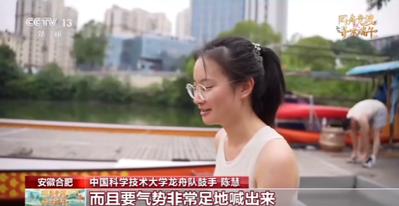 中国科大龙舟队成立于2012年,队员中有学生、有教职工、有留学生,共一百人左右,人才济济。就读于中国科大电子信息专业的大三学生张之扬担任舵手,就读于工商管理专业的硕士研究生余颖莹和物理学院研一的张骏杰都是划手,哲学专业的博士研究生陈慧担任鼓手。俗话说:“要想龙舟快,全靠鼓手带。”鼓手陈慧加入中国科大龙舟队才一个多月,正在抓紧学习,训练自己的节奏。龙舟队队员娄聪聪教陈慧如何做好鼓手:“先用鼓槌的一个曲点,这个点敲击鼓的左面,然后向外,这样能够敲得很响的时候,也会出现,比如向下,会有连击的声音。”陈慧学着他的样子敲出鼓点。“对,用力、激情。”娄聪聪鼓励道。谈到在龙舟队担任鼓手的感受,陈慧说:“要非常细心地观察大家的节奏,而且要气势非常足地喊出来。左手科研,右手龙舟,非常快乐。”