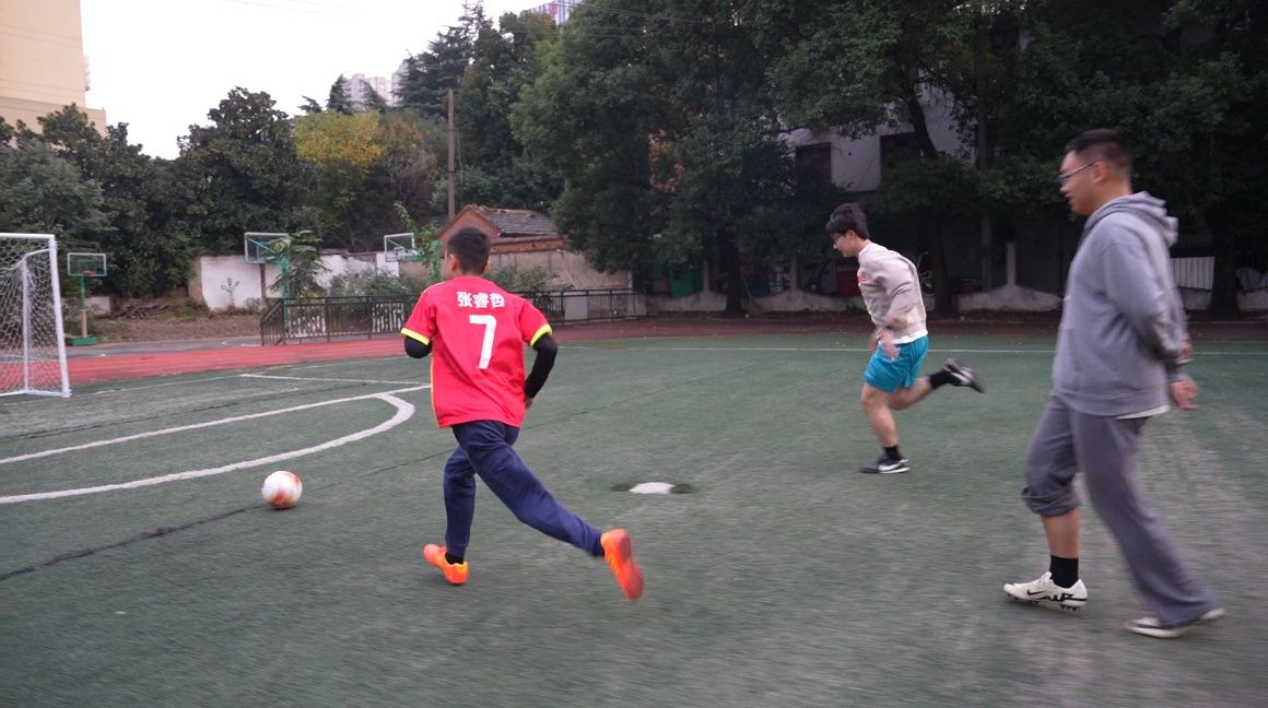 但让这些孩子们学会踢球,远比想象中要难得多。第一节课,光排好队就花了几十分钟。重复是方浩然在足球课上最常做的事。他一遍遍地给孩子们耐心示范,在网上学习技能教程,给孩子们列训练计划。他的坚持和用心点燃了孩子们对足球的热爱。慢慢地,孩子们学会了用脚踢球,合作传球,用力射门,他们开始渴望比赛。为了支持孩子们的梦想,原本只想着孩子们多运动运动就好的家长们,也开始认真地讨论起买什么球衣球鞋,印什么号码。就这样,天天向上足球队正式组建了。