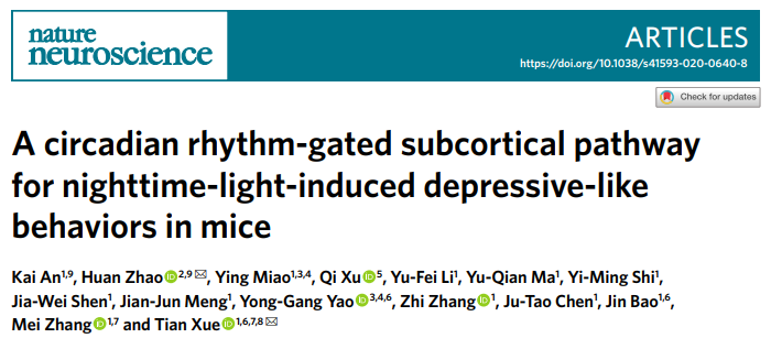 记者6月3日从中国科学技术大学获悉,该校生命科学学院、中科院脑功能与脑疾病重点实验室薛天课题组,首次描述了介导夜间异常光诱发抑郁样表型的神经环路结构与功能,证明了夜间不正常光线是造成抑郁样行为的主因,诠释了光在白昼和夜晚截然相反情绪作用的内在机理。相关成果于6月1日在线发表在《自然-神经科学》上。
