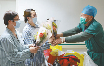 中科大附属第一医院安徽省立医院的女医疗队员刚刚走出病区,就惊喜地收到鲁朝晖书记代表医疗队党支部送上的鲜花。