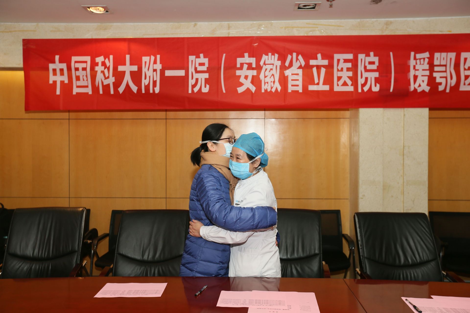 临行前,中国科大附一院(安徽省立医院)心血管内科护士长叶祺亲切拥抱白璐,为她打气。