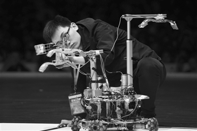 10月27日,中国科学技术大学第十九届RoboGame机器人大赛举行,该校12支学生代表队带着他们设计和制作的机器人参赛,本次比赛的主题为“越障救援”。图为一名大学生在比赛前调试机器人。