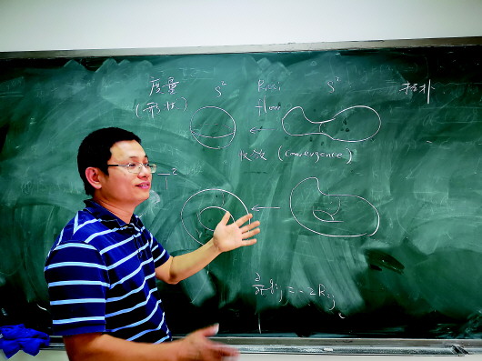 “我们在沙滩上看到的鹅卵石大多是圆润的,它一开始可能有棱有角,但随着时空流转、潮起潮落,形状会越来越接近完美、标准。然而即便再完美的演化,鹅卵石也可能包含一些异变之处,几何上称为‘奇点’。简单来说,‘哈密尔顿—田猜想’即猜测大多数地方都是完美的,而‘奇点’的大小是可控的,被限制在一个低维空间。”陈秀雄说,他和王兵,就是在数学上严格证明了这个猜想,并以此为基础证明了分析领域的“偏零阶估计猜想”。