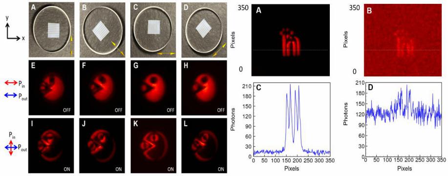 科研人员用线偏振光照射超表面器件会发生光自旋霍尔效应,从而使两个圆偏振的出射光场在空间发生微小的平移,出射光场的中间部分的偏振态还是线偏振,边缘部分是圆偏振,通过检偏器可以提取待成像物体的边缘轮廓。利用偏振纠缠光源中的一个光子进行照明,由于该光子含有两种可能的偏振状态,在另外一个光子没有进行测量的时候,成像的状态是未知的,通过测量另外一个光子的状态,用于照明的光子的偏振状态也会随之确定,因此通过远程切换纠缠光子对中的用于触发的光子的偏振状态可以得到不同的成像效果,可以实现成像的模式在正常模式和边缘探测模式的远程切换。此外,偏振纠缠光子在时间上也具有极高的关联性,通过纠缠光源照明,并且利用符合探测的方式,我们证明了在极弱光场照明下,在单光子CCD采集的总等效光子数相同的情况下,基于纠缠照明和符合探测相对于直接照明探测具有更高的信噪比。