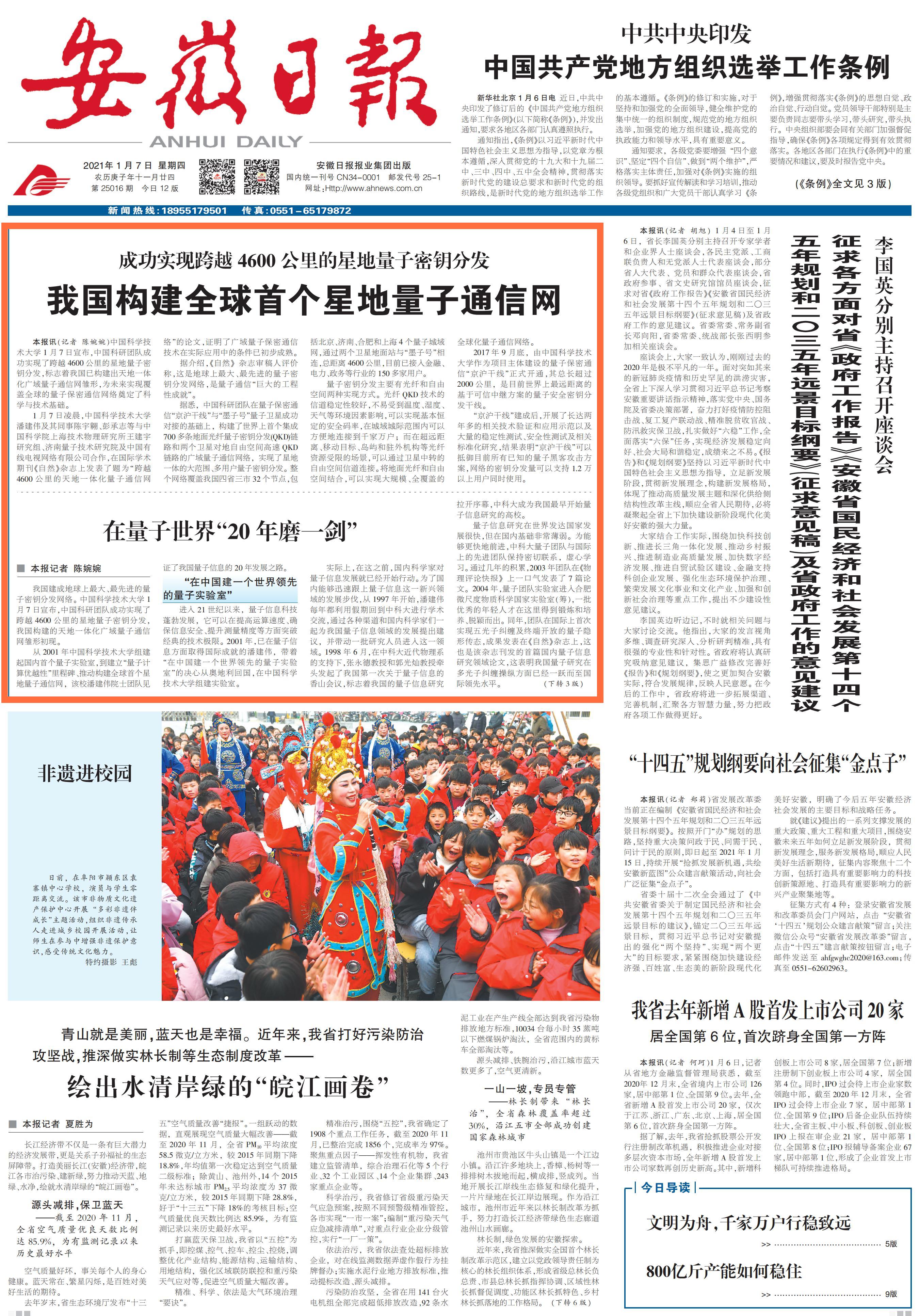 《安徽日报》(2021年1月7日头版)